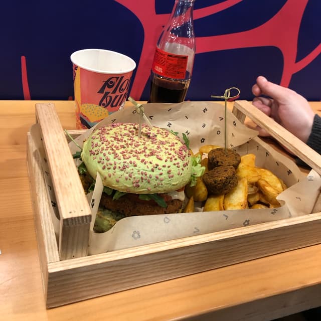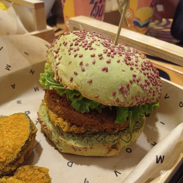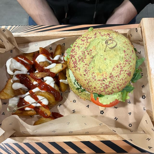 🇮🇹 Ma che buono! Ho assaggiato quasi tutto al Flower Burger e questo è il mio favorito per adesso, peccato che edizione limitata 😩 io chiederei di aggiungerlo al menù fisso. Come sempre tutto molto buono, locale accogliente, belli disegni e altalene al posto delle sedie, personale gentile. Bellissimo che è tutto carra e tutto compistabile, niente bottiglie di plastica, per l'acqua ti danno un bicchiere di carta e la prendi te stesso alla spina, in più, puoi scegliere fredda, temperatura ambiente o frizzante. Direi soltanto una cosa di "negativo" che dovrebbero migliorare, i tempi di attesa, sempre che andiamo, ci sono solo due persone, una alla cassa e una in cucina, direi che i prezzi non sono neanche bassi, e vorrei più personale, per i clienti che attendono e per loro stessi, deve essere stressante lavorare così, con una lunga fila di persone in attesa. Mio marito, qualche giorno fa, ha aspettato 40 minuti per 4 hamburger da asporto, per me, troppo. #FlowerBurger #BurgerVegetale #VeganBurger #Veganodiasporto 🇪🇦 ¡Buenísima! He probado casi todo de este restaurante y está hamburguesas se ha convertido en mi favorita, que pena que sea una edición limitada, yo sugeriría que la añadan al menù fijo. Todo bueno como siempre, local acogedor, con alegres dibujos y columpios para sentarse en vez de las sillas, muy chulo. Todo de papel, todo reciclable y/o compostable, no hay botellas de plástico, para el agua te dan un vaso de cartón y la coges tu del grifo, se puede elegir, fría, del tiempo o con gas. Una cosa que creo que podrían mejorar, es tener más personal, a veces hay que esperar mucho, una persona en la caja y una en la cocina, me parecen poco en horas de comida y cena. Miarido, hace unos días, tuvo que esperar 40 minutos por 4 hamburguesas para llevar. Además, que si mi valoración es alta, por ser vegano y atento al medio ambiente, me gustaría que lo fuera también a los trabajadores.
