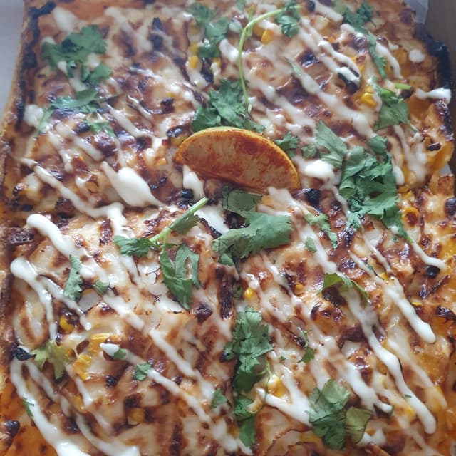 🌞SUMMER SPECIAL 🌽 Elotes Pizza I always trust Boxcar to make unique and delicious pizza. This one has mozzarella, cheddar, corn, garlic, lime crema, cilantro and lime wedge. Normally I don't like corn on pizza but everything from Boxcar is amazing. We added some Cholula hot sauce to ours and I recommend trying this 😋 #veganisnotscary #veganin2024 #abillionlove #ditchdairy #cheese #vegancheese #pizza #veganpizza #corn