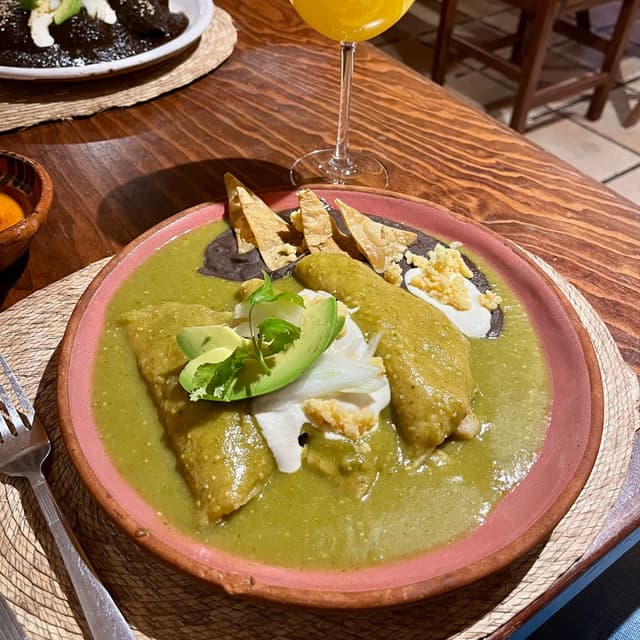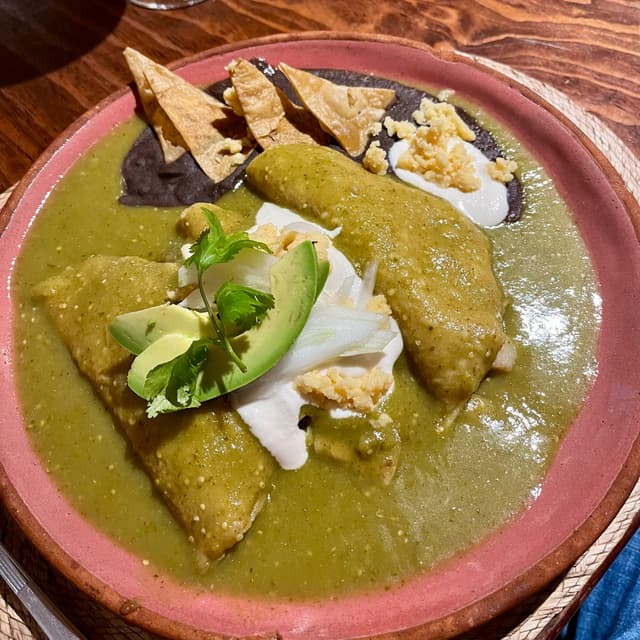 Debajo de toda esa salsa 😅 hay 3 enchiladas rellenas de papa, va frita con cebollita y les queda muy rica 😁 La salsa verde sabe muy bien también pero lo malo es que la dejan muy espesa por lo que cae un poco pesada. También me gustaría que le pusieran más crema y quesito de garbanzo porque le ponen súper poquito 🥹 pero se compensa con el aguacate y los frijoles. Considero que porción es adecuada 👍 #veganenchiladas #govegan #veganmexicanfood #mexicovegano #veganiseasy