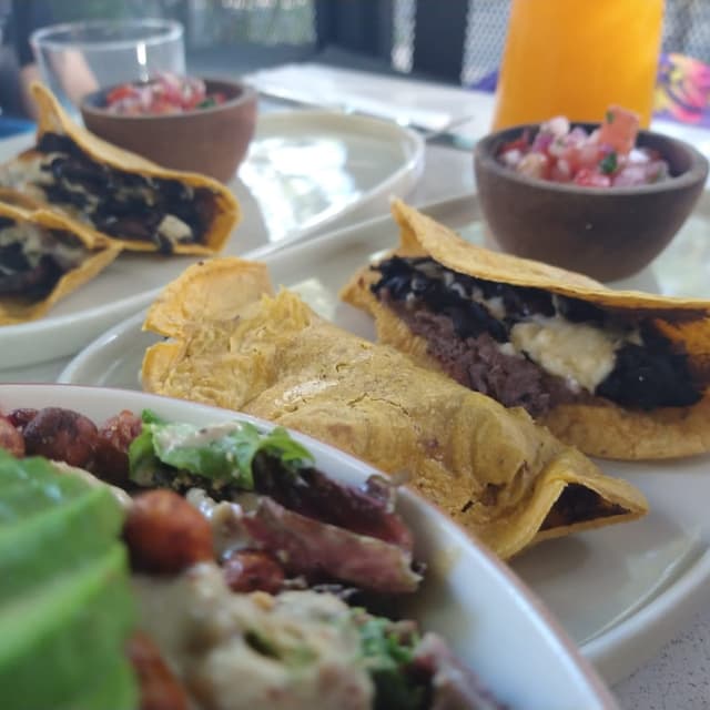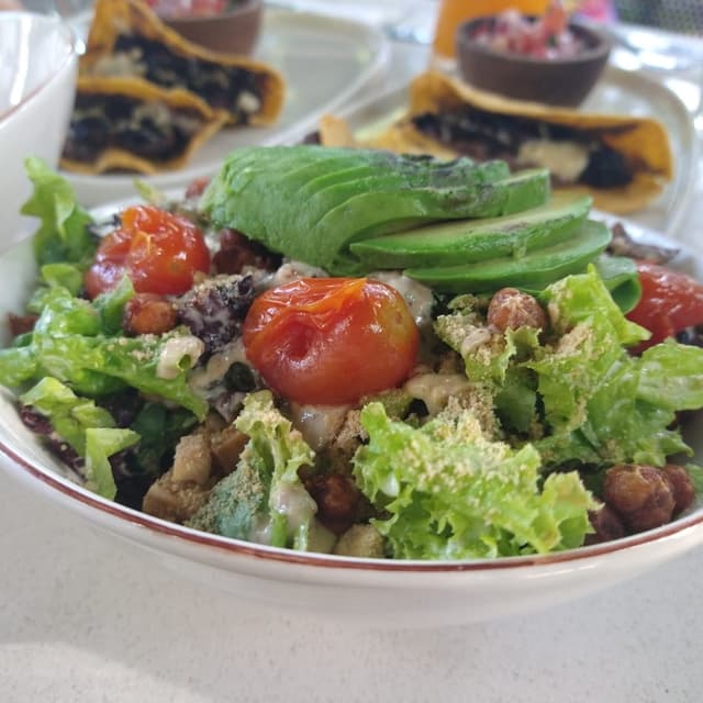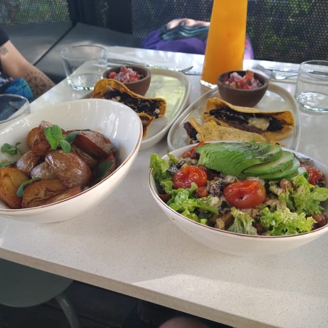 La ensalada Caesar estaba bastante rica, tenía paltas y todo estaba fresco. Las papas poco originales, abajo tenían mucho aderezo de ketchup y no estaban tan buenas. Los tacos eran exquisitos, con hongos y hummus, le faltaba un poco de sal pero eso es un gusto personal. Luego pedimos un licuado de maracuyá, fresquito y con un regusto a coco
