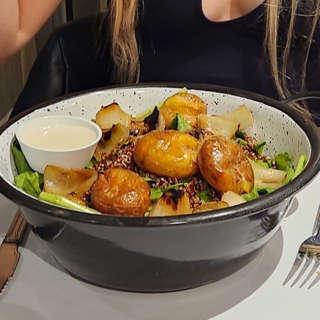mnl9 months agoSee TranslationEs una ensalada para compartir que tiene espinaca, quinoa, papines, cebolla y una salsa de caju y lima. Muy recomendable.0