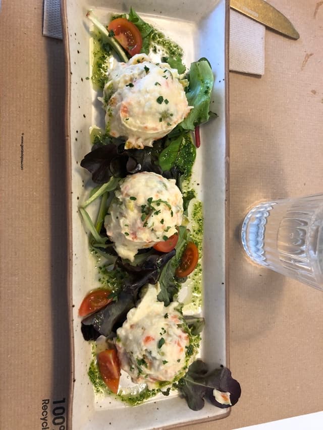 Ensaladilla rusa riquísima! Viene acompañada de tomates cherry asados que le dan un puntito muy bueno. El plato es sin gluten aunque, al ser un sitio pequeño, no pueden asegurar las trazas 😥 pero intentan tener cuidado para que no haya contaminación cruzada. El personal es muy amable y el local es pequeñito pero agradable.