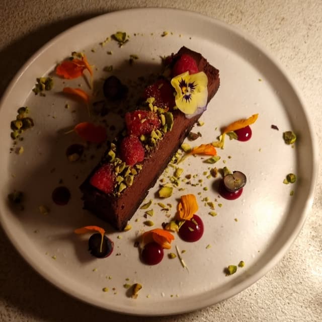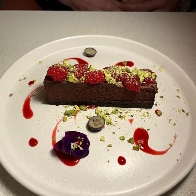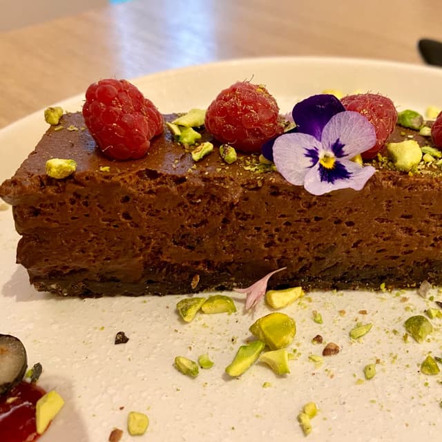 Brownie húmedo con mousse de chocolate aireado, frambuesas y pistachos. Yo no suelo elegir postres de chocolate, no son mis favoritos, pero este era el único que me faltaba por probar de la carta, así que me decidí, y no me arrepentí. Esta superjugoso y el sabor intenso a chocolate negro combina a la perfección con las frambuesas y los pistachos. Para verdaderos fans del chocolate, eso sí, porque como digo el sabor es intenso. #vegandessert #chocoholic #veganbrownie