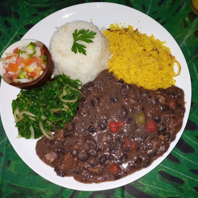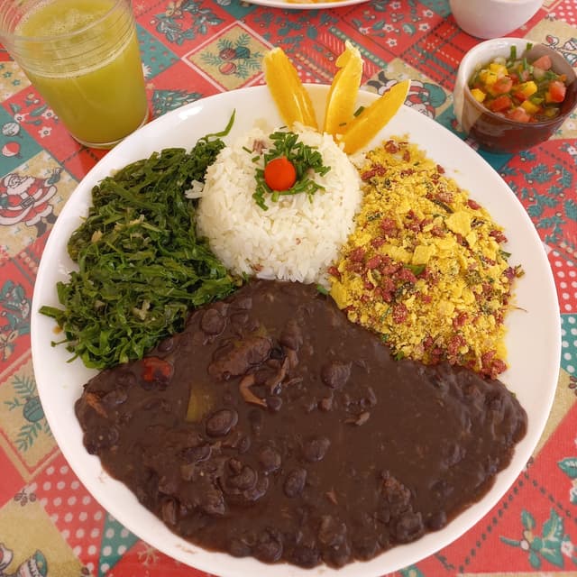 Um prato delicioso! Foram servidos: feijão com legumes e carne de soja, farofa acebolada, couve verdinha acebolada, arroz branco e vinagrete, além de laranja de sobremesa. Foi um jantar muito prazeroso na pousada!!!