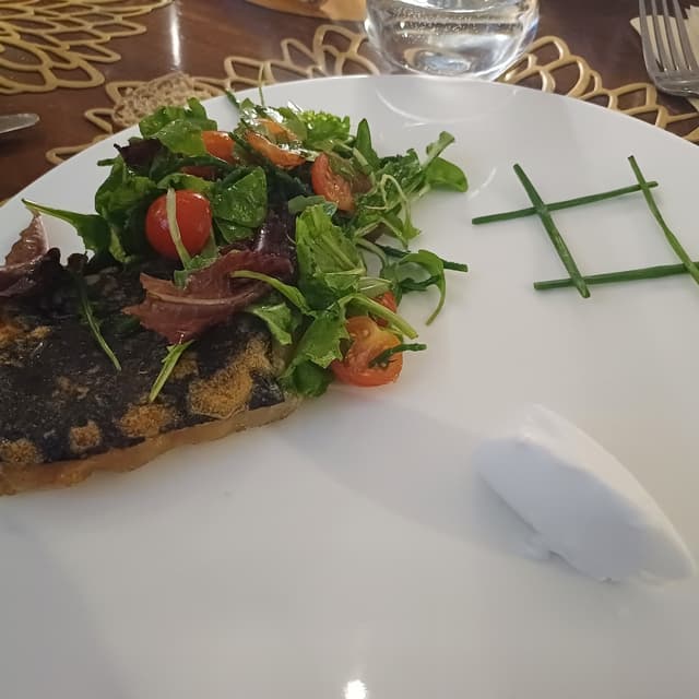 Delizioso filetto di salmone con alga nori, rucola, valeriana pomodorini e piccola porzione di formaggio vegan. Il sapore e' molto delicato e ricorda davvero tanto quello del salmone per onnivori, perfetto con la salsa di soia. L'impiattamento molto elegante. Da provare, davvero una bella esperienza!
