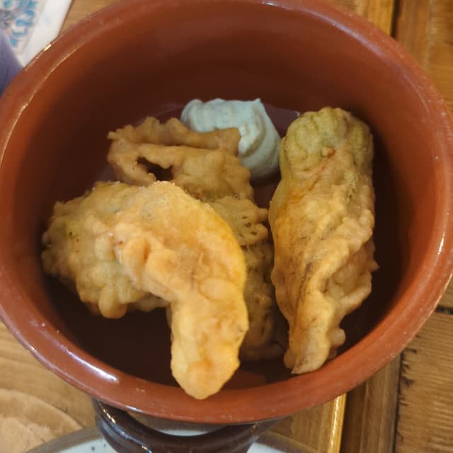 Fiori di zucca ripieni di stracchetto e pomodori secchi, accompagnati da una mayo alla salvia. Frittura croccante, non unta e non pesante. I pomodori secchi forse coprono un po’ il fiore di zucca. Mayo buonissima è molto fresca