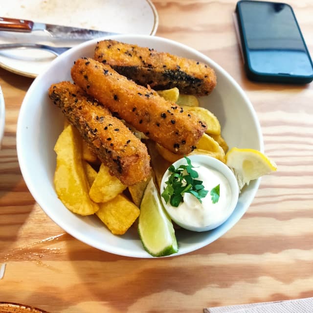 Fish and chips de tofu e nori. En vez de salsa tártara sérveno con alioli, que tamén está ben.