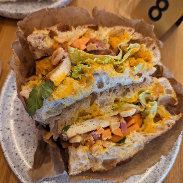 regimack2 years agoSee TranslationDelicious sandwich of tofu, carrots, lettuce, and sweet potato in a Thai peanut sauce on focaccia bread #veganisnotscary0