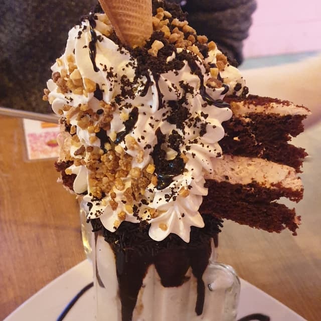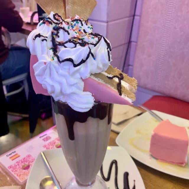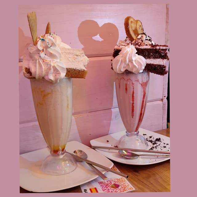 Muy rico, puedes elegir el sabor de batido que quieras, y te lo ponen con nata, el trozo de la tarta que elijas y dos toppings. Un gran punto a favor que las pajitas sean de acero reutilizables