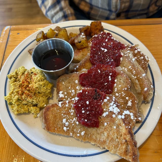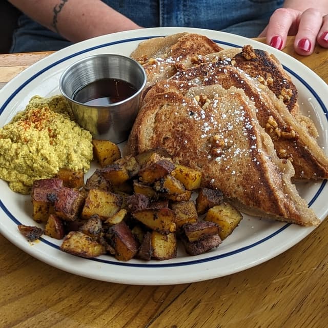 Sometimes, just a good old plain French Toast hits the spot. I was really craving these thick cut French toast pieces this morning. Last time I had their seasonal pumpkin butter and strawberry, but I think I just like plain with #maplesyrup is the best. This Happy Little Treats brioche bread is so thick and fluffy and it reminds me a lot of the French Toast I had at Modern Love Brooklyn two years ago. This is also served with a delicious #tofu scramble and seasoned home fries. The potatoes were excellent today! They were crispy, buttery and seasoned to perfection. One plate was about $15, but it was huge. #veganisnotscary #veganfortheanimals #breakfast #govegan #ditchdairy