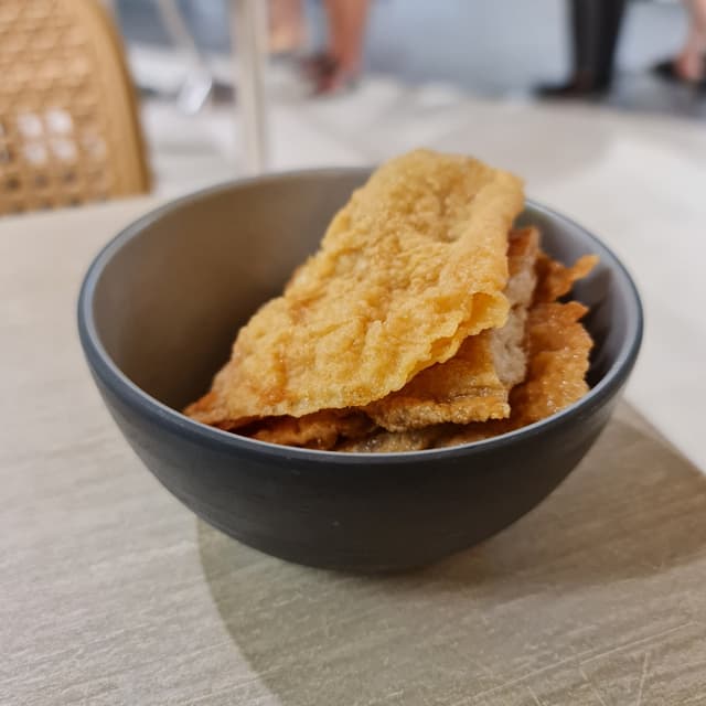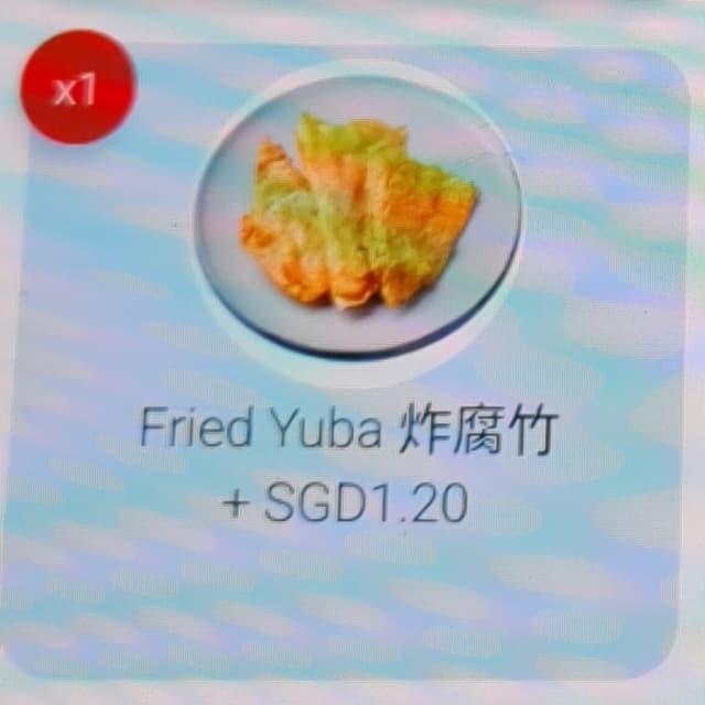 $1.20 (add-on) for 3 cut squares of #sweetdreamsaremadeofgrease #yuba (more blotting needed pls) with any mains order via the self service kiosk. Here we have #konnyaku in place of meaty fishpaste for an overall crunchy, layered bouncy bite 😋 #alliumfree #soy