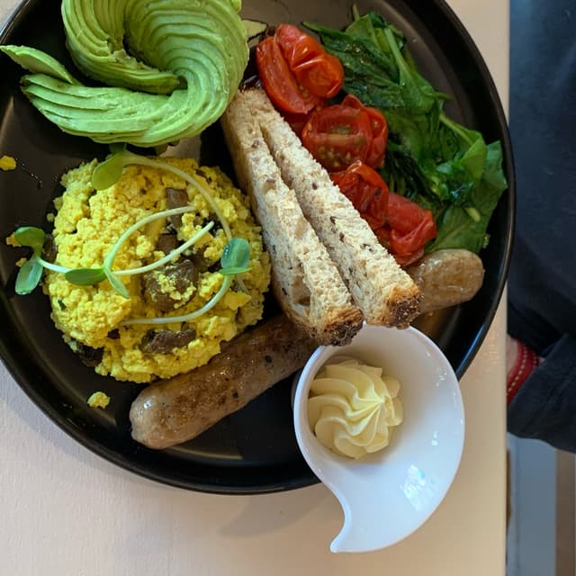 Gouri Barua4 years agoSee TranslationSeriously yum! Includes #locallysourced herbiwors, bacon, scrambled tofu, stewed tomato, two slices of toast, butter and jam.0