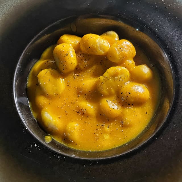 Il piatto è buono ma mi aspettavo qualcosa in più. Forse è la tipologia di zucca usata per la crema che non mi fa impazzire, o forse la quantità di crema di zucca rispetto agli gnocchi. Non penso li riprenderei