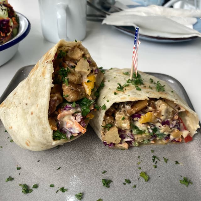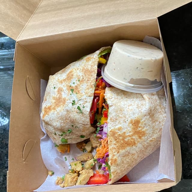 Lemon & herb marinated grilled seitan “Vicken” and maple “Vacon”, crunchy veg. I always ask for the sauce on the side if possible because it can make or break a dish. The creamy ranch dressing was delicious though, could have even done without it as the filling was seasoned well. 💰R99 ( gf option +R20)