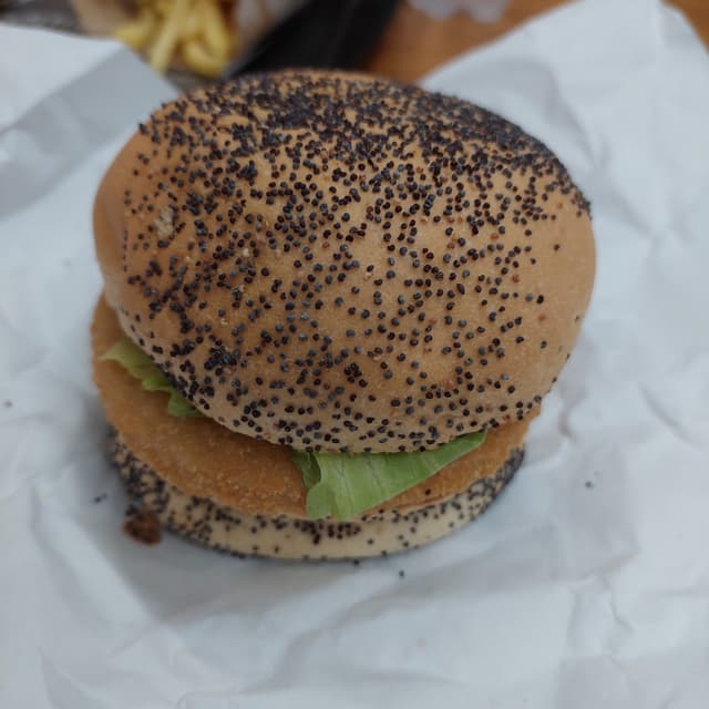 Hamburguesa not chicken crispy, con lechuga, tomate y mostaza. La imagen no tiene pinta de nada, pero muyy rica, sùper recomendable.