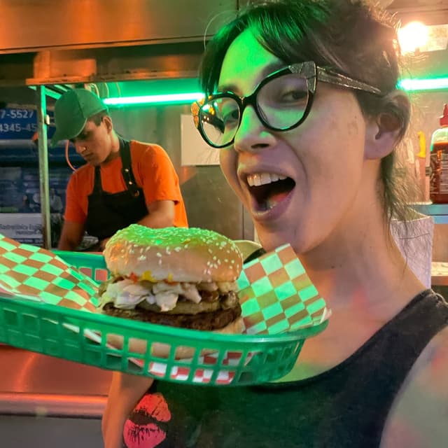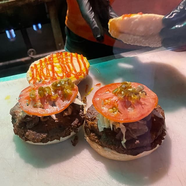 Hamburguesas caseras ideales para cumplirte un antojos. Están de buen tamaño, deliciosas por su sazón al carbón y la no carne es receta de la casa. La relación calidad-precio está bastante bien y me encanta que siendo un puesto en la calle, la presentación sea tan buena como de food truck. El arte de preparar una hamvurguesa. 😎 #plantbasedburger
