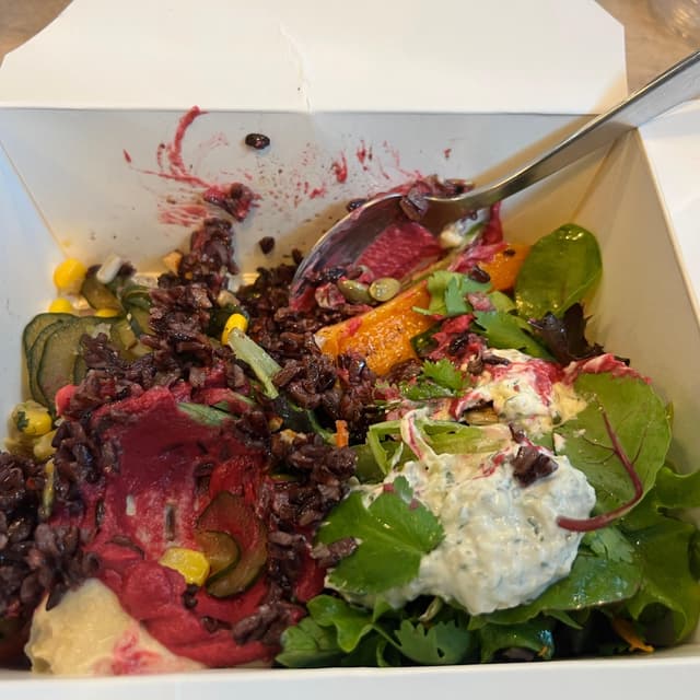 I missed some protein on it.. 🍖. But apart from that it was tasty! Very colorful as well, makes me happy as the name says 😊 PD: can't find emojis for plant based protein so just pretend that is mock meat 😂 ☘️