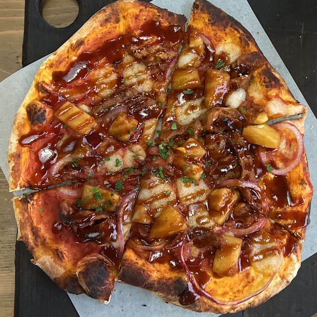 Normally I would say pineapple does not go on pizza but we got this on a wine-fueled whim and it’s great! San marzano, caramelized pineapple, maple bbq shred, red onion, cashew mozzarella