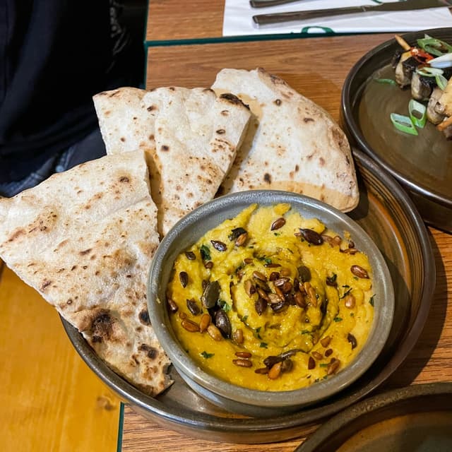 A delicious hummus with very light, fluffy flat bread and lovely roasted seeds on top!