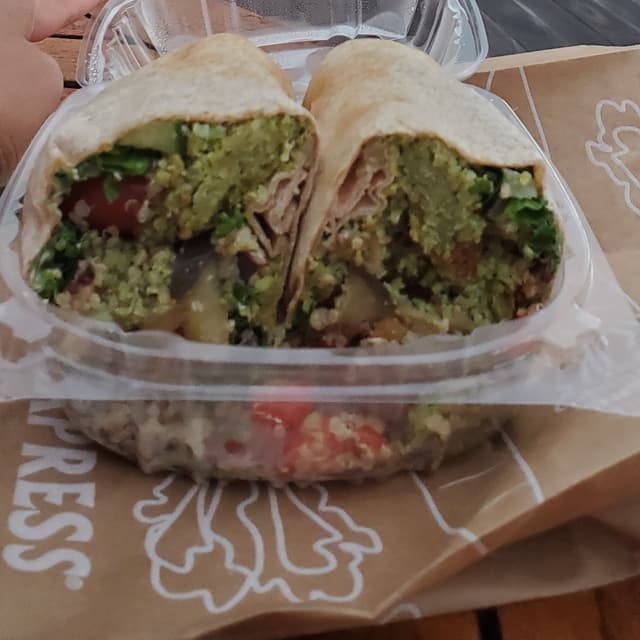 The Bomba wrap was a good meal. The wrap was kind of dry , it had grilled eggplant, falafel, tomatoes quinoa,, tomatoes....the cilantro dressing was the complement I needed. I ordered from this place, cause my friends and I are going to have dinner in a restaurant and I didn't find anything in the menu, so I rather eat now than don't have dinner. It was a good option. #tierradeanimales
