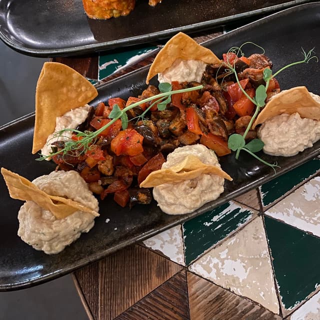 Buonissimo! Insalata medio orientale a base di melanzane, pomodori e erbe aromatiche, accompagnata da hummus e nachos