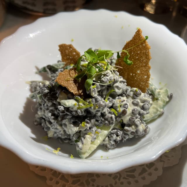 🇫🇷 Beluga #lentils with #greenbeans 🫛in a rémoulade which I’m not sure what that is. There’s also capers and shallots, Granny Smith 🍏apples and crispy 🌾buckwheat. €10. It’s a tiny portion as most dishes are here. They recommend 3 dishes per person but this scared our budget minded mentality and I think we ended up doing two each for 4 people. The fussy French’s brother loved this place but I wouldn’t rush back. It’s in the #michelin guide so maybe too high class for me. I was trying to get everyone to go for a burger afterwards but when we got there no one was hungry indeed. Sad. #veganrestaurant #saveveganrestaurants #french #veganinfrance #paris