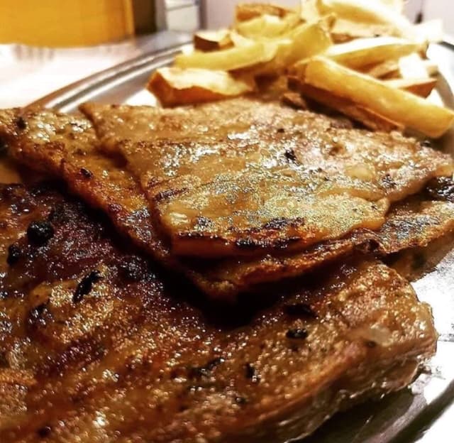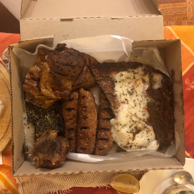 Parrilla para dos, trae: matambre a la pizza, 1/2 provoleta, 2 chorizo y seitan parrillero, viene acompañada de una guarnición (papas fritas o ensalada), una salsa a elección (criolla o chinichurri) y pan. Esta muy buena y sobra bastante para dos