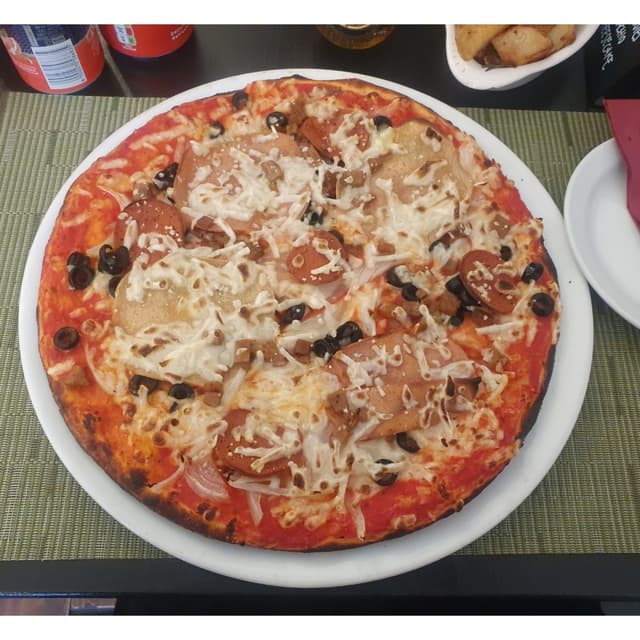 This pizza was incredible! Topped with vegan ham, chick*n, olives, pepperoni, and a homemade vegan bacon which was delicious! Not too spicy, it's listed on the menu as 'mild', which I'd say is accurate. Great little place for a date night/special occasion as it is a little pricey 🥰