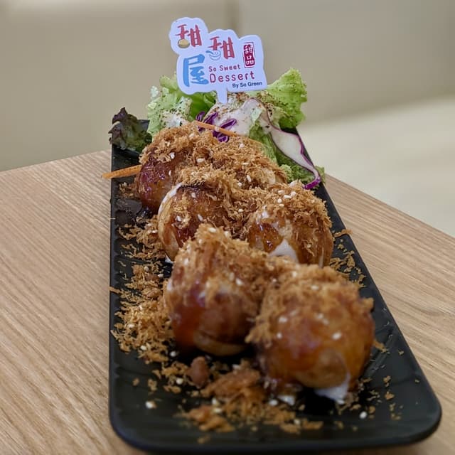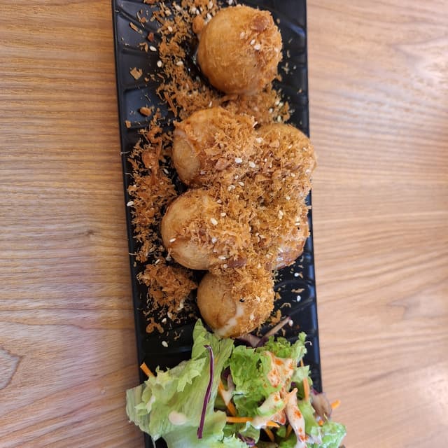 Takoyaki balls drizzled with vegan mayonnaise alongside sesame seeds and 'meat floss' (which I believe is more Filipino fusion-style)! Within the takoyaki balls, there were some kind of seafood tofu sticks that were pleasantly chewy. 🍢🦑 Fun and savoury bites that I couldn't help popping into my mouth! Personally, I felt the batter on the outside was a tad firm and could have been slightly thinner / more crispy, while the inside was somewhat dense and could have been slightly softer / more gooey. Swipe right ➡️ for a close-up of the cross-section~ 📸 Nonetheless, texture aside, this was really yummy!! I believe this is the first (and only??) vegan takoyaki in Singapore, so I would highly recommend trying it! 🥰 They have a seaweed version too if 'meat floss' seems too unconventional. (Allium-free, $7.90) #sgvegan #japanesefood #alliumfree