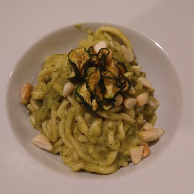Spaghetti con zucchine e crema di zucchine, che ricalca la tipica pasta alla nerano omettendo peró i formaggi. Buona e molto ricca di condimento che rimane dolce e delicato. In altri ristoranti della città si trova questa stessa pasta in porzioni più abbondanti, più saporita e a un prezzo inferiore.