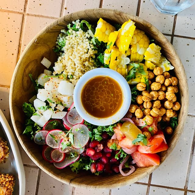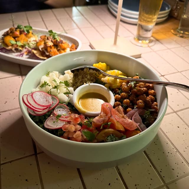 First time trying super loco brunch menu. Ordered this Mexican chopped salad and added on quinoa-crusted tofu. Love the salad - super refreshing and flavorful! First time seeing quinoa crusted tofu - texture is interesting! In the salad: heirloom cherry tomato, kale, jicama, sweet corn, quinoa, radish, crispy chickpeas, pomegranate, chili-sherry dressing