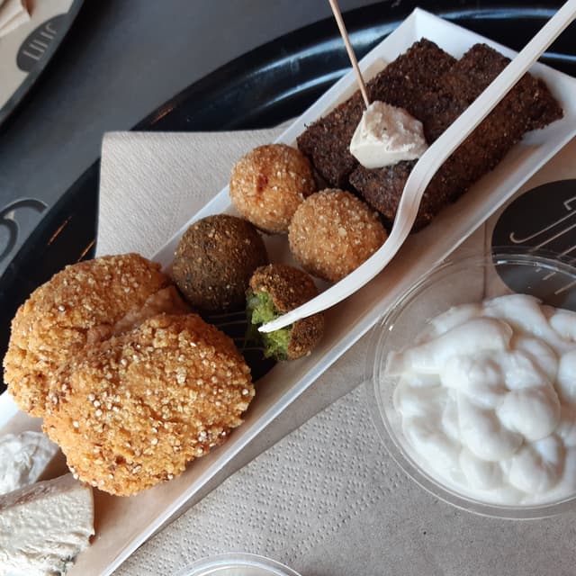 Mix di antipasti davvero ottimo. Nel piatto sono presenti olive ascolane con granulare di soia, mozzarelle in carrozza con mozzarella di arachidi, falafel speziati, polentine e Brie di arachidi. Il tutto viene accompagnato da due mayo vegetali, una classica e una all'arancia fermentata. Davvero gustoso.
