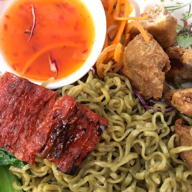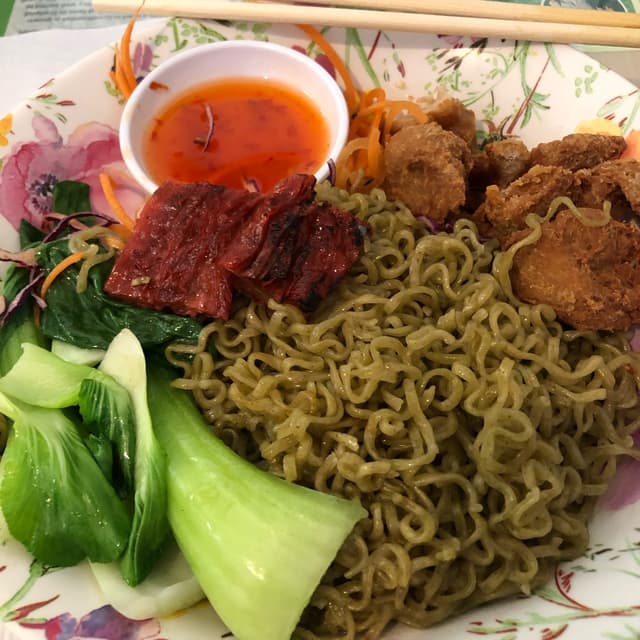 This green noodle is derived from the moroheiya plant (or mallow leaf). It contains many vitamins and minerals. It was very lightly seasoned with a nice chewy texture. On the side was their crispy chikin, famous spare ribs, baby bok choy, and sweet and sour dipping sauce.