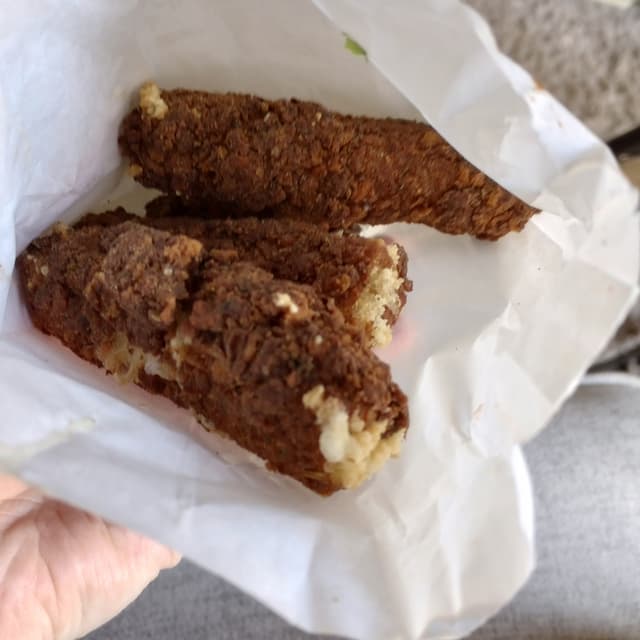 It's been over a year, maybe 2, since I reviewed these and want to update the product since it's different now (and improved) 7-12-24 One order comes with 4 melty - cheezy mozzarella sticks that are battered, crispy and fried. The breading is well seasoned and has a kick of spice! The cheeze is so melty and delicious and I love the marinara sauce. Sometimes I also get a side of Ranch. These are less than $10 and are a great appetizer for sharing. They definitely are a little bit greasy, but treat yo' self. #veganfortheanimals #abillionlove #ditchdairy