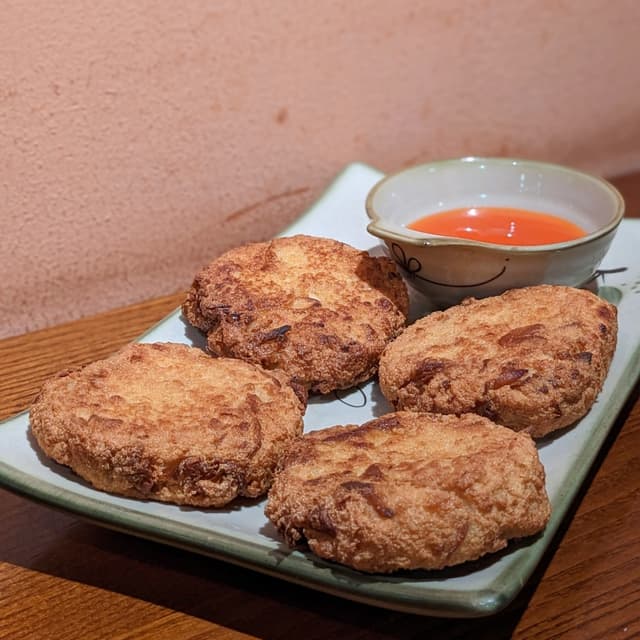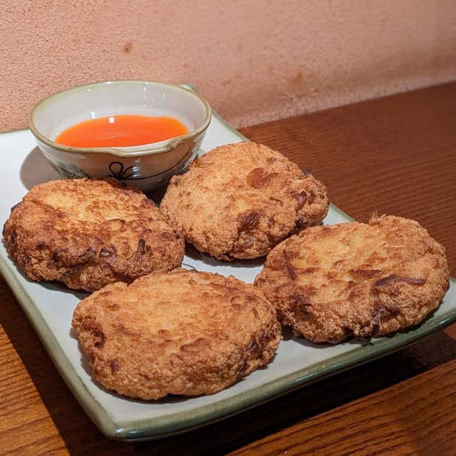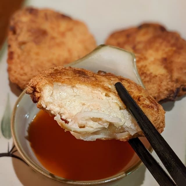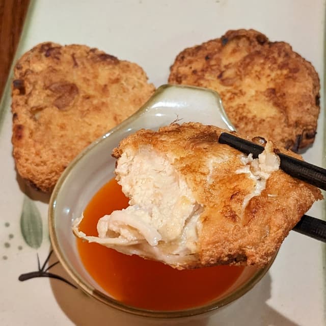 Fried tender tofu patties interspersed with chewy shredded oyster mushrooms. 🍄🍢 Loved the unique umami flavour and variety in texture! Not too oily either. Swipe ➡️ for cross-section! Would highly recommend this bestselling dish. My companion who doesn't usually like fried food also raved about this. (50,000 VNĐ / 4 pieces) #vietnamese #vietnam #veganvietnamese #wholefoodplantbased #wfpb
