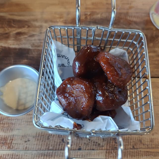Deliciosas “alitas” a base de tofu y trigo, ellos mismos las preparan. Puedes elegir entre varias salsas como búfalo, BBQ, ajo-parmesano y hay otras 2 opciones si no mal recuerdo 🤓 Yo las pedí de BBQ y están deliciosas, su textura es medio esponjosa pero el sabor muy rico. Vi que también las venden congeladas para que puedas prepararlas en casa. Súper recomendables 😋😋
