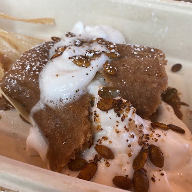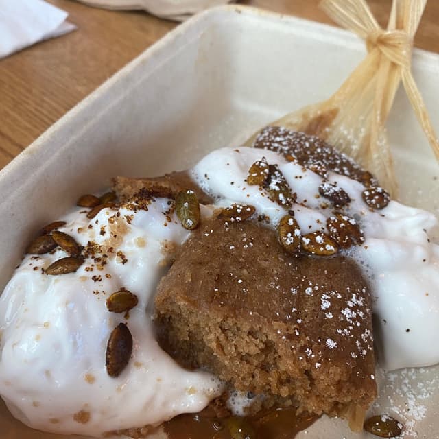 This was amazing. Vegan Nutella under Nutella infused masa with whipped coconut cream ! With the Nutella it’s super sweet but without my dad really liked it because it wasn’t too sweet. tasted exactly how it sounds. Like Nutella masa and coconut creme. I think they used vego chocolate spread or made their own
