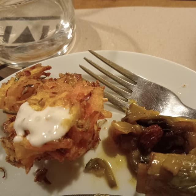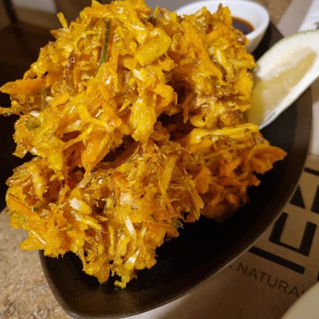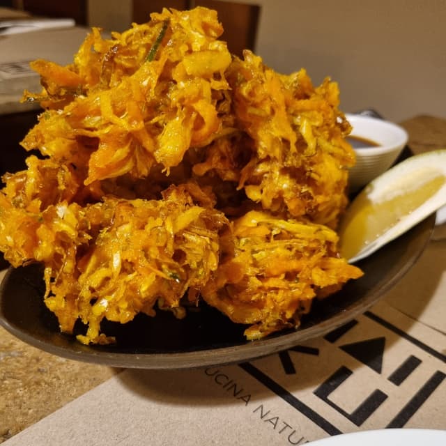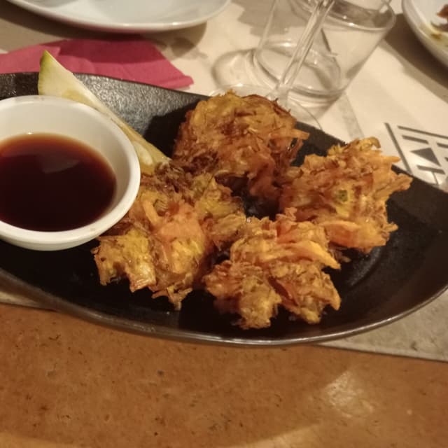 verdure (zucchinette, carote, cipolle) pastellate in una tempura sorprendentemente croccante. Difficile smettere di mangiarle