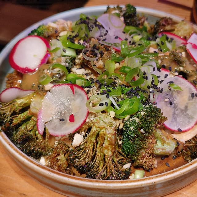Brocoli frito con una salsa buenisima!! Salsa goma ponzu y cacahuetes tostados. Me lo recomendaron y ha sido un acierto. Por 6,90 €