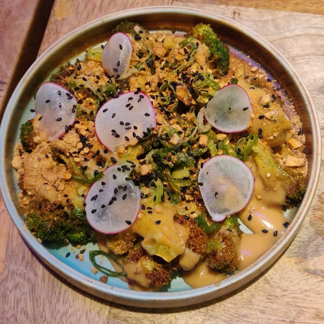 Normalmente voy variando lo que pido, pero lo que no varía nunca es esta tapa de brócoli frito, está súper rico, crujiente y muy sabroso con la salsa de goma ponzu que es una delicia,y los cacahuetes tostados que le dan un toque acertadísimo. 6,90€ #barcelonavegan #dogfriendly