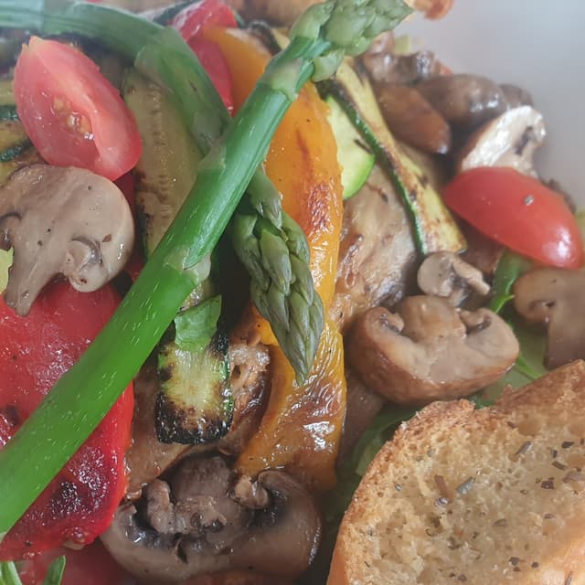 A healthy portion of a mixed grilled #vegetable #salad . The vegetables included #aubergine , #sweetpeppers , #asparagus, #babymarrow and #mushrooms . There were fresh #tomatoes and #lettuce; and crispy #croutons . The salad wasn't overly seasoned, giving the option to add a dash of #balsamicvinegar .