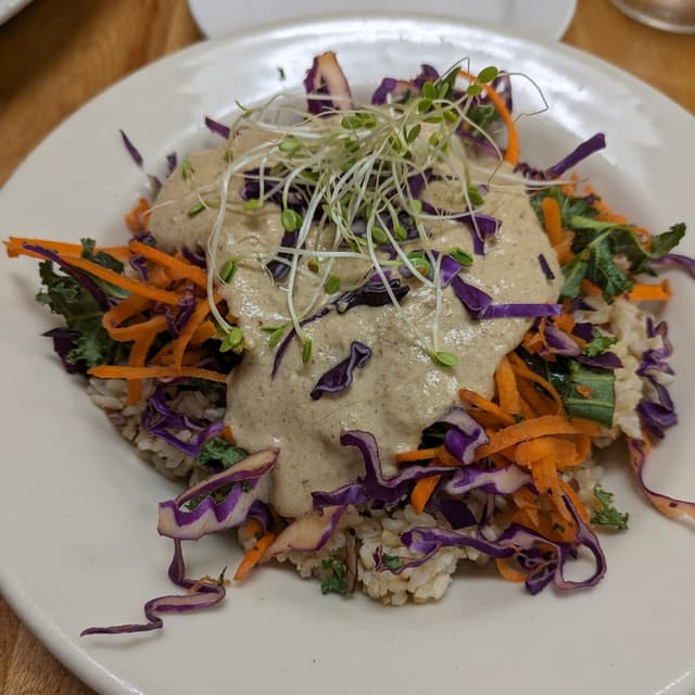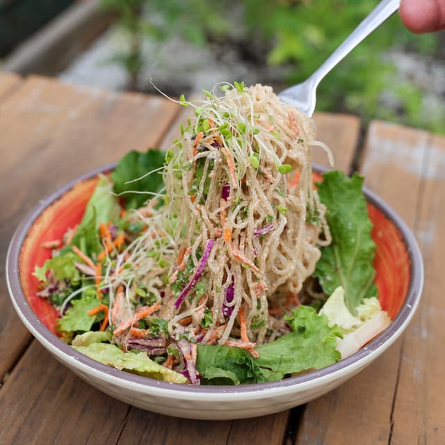Portia's Pad Thai is awesome. I can't believe it's taken me so many years to try it. I had honestly heard not great things about it, just because it's not like normal Pad Thai. It's a raw version, so she also doesn't use peanuts because they're highly allergenic and often have mold. Instead, I believe she uses almonds and coconut milk, which are actually better for you. I believe they also use kelp noodles so they are #glutenfree you can also get it on brown rice as a base. I love how this Pad Thai is full of veggies, including peppers, onions and locally grown broccoli, and sunflower sprouts. Additionally, they use fresh lettuces that are locally grown. Portia is all about getting all of the nutrients in her dishes. This dish does have soy due to the liquid aminos, but like everything at Portia's, it's gluten-free and mostly #organic She always sources locally when possible, and you can actually see the farmers coming and dropping off the produce, which is awesome. I definitely recommend this dish! You can also have tofu added to it if you wish. It is a bit more pricey because its raw and they have two different sizes to choose from. This was the $14 dish. #veganfortheanimals #abillionlove #veganisnotscary #rawvegan