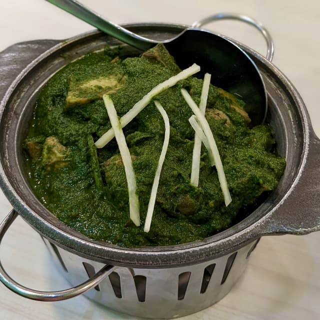 Creamy pureed spiced spinach with potato chunks, North Indian-style. Tasty and spicy on its own, though easily overshadowed by other spicier dishes. Remember to ask for the vegan version without any drizzle of dairy cream. (Allium-free, $10.50) #sgvegan #minorityowned #wholefoodplantbased #wfpb