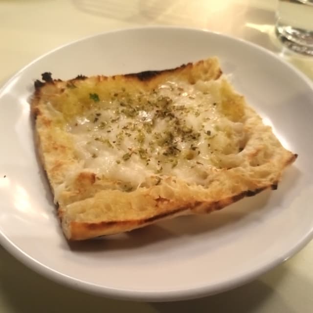 Pan de ajo y queso vegano. Crujiente y sabroso. 2€. Entrante de la carta vegana que dispone esta pizzería. Amplia variedad para que no haya excusas a la hora de elegir comida elaborada sin muerte de animales.