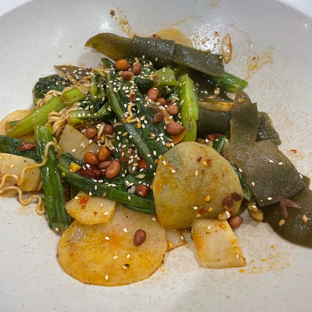 Ordered one of the vegan sets available (although both seem to be identical?) Came with leafy greens, seaweed, potato and peanuts. It was really tasty and had a lot of heat at the medium chilli level, but I kinda wish the set came with tofu or something to add to the protein content. The vendor wouldn’t allow me to add on to it. Really filling though and i loved the springiness of the noodles.