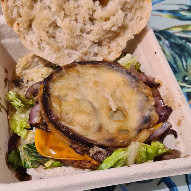 martaeffe4 years agoSee TranslationPanino con pane fatto da loro, arricchito con semi. Al suo interno c'era un hamburger vegetale, crema di carciofi, insalata, cheddar veg, melanzane panate e cipolle di Tropea. Consigliatissimo!0