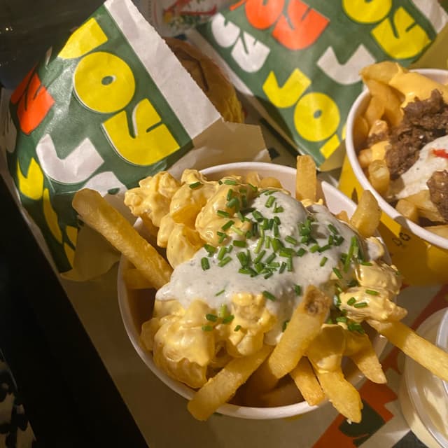 Fuimos a cenar a Joy Burgers y decidimos pedir una de las papas, que vienen con la hamburguesa, con Mac & Cheese, y el resultado fue mejor de lo esperado. La combinación queda riquísima! Además te dan cubiertos de madera para que se reciclen más fácilmente. El lugar tiene otros detalles amigables con el medioambiente como que sus cestos de basura son de plástico reciclado. Todo en el lugar es vegano, y el ambiente es muy cálido. Las personas que atienden son muy amorosas. Recomiendo totalmente ir y animarse a probar esta opción de papas fritas que son un viaje de ida! Los precios son de enero 2023. Dos hamburguesas + dos gaseosas (lata) + las papas con el Mac & Cheese nos salió $4840.