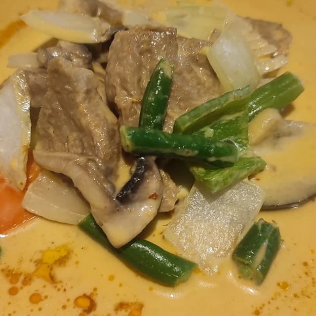 Very delicious red curry with coconut milk and some pieces of vegan seitan duck.