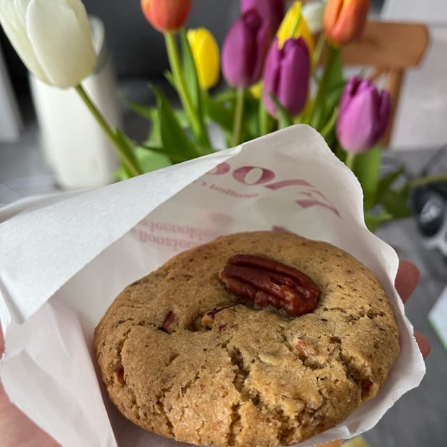 🍪 Yummmm. My second cookie from Floozie Cookies, and now I’m kicking myself that I didn’t get 6 for £17.50. 😭 The Pecan Pie is delicious as well. I love the texture and consistency and flavor. It’s crunchy on the outside edges but then is crumbly and chewy in the interior. There’s a sweet pecan cream or paste in the center and it’s just divine with the crunch of the #pecan. I’m really irritated 😠that I missed this #allveganrestaurant well bakery for so long. How is that possible?!!? We need to have a directory of all vegan🌱 establishments to refer to easily so we don’t miss any. Ben’s Cookies is just upstairs here and they do one or a couple vegan chocolate 🍫chip cookies. This is far better and a larger vegan range to choose from so come down the stairs here. You can order online and they have other shops in Bicester Village, 🇦🇪Dubai, and 🇸🇦Riyadh amazingly?!? They also serve ☕️coffees, hot 🍫chocolate, and shakes 🥤which would be very interesting to try with marshmallows, whipped cream, and flavor shots available. I’ll have to get a drink next time too but I worry about going into sugar shock! 😆 Your #sweettooth will be soaring here. #saveveganrestaurants #veganrestaurant #veganbakery #bakery