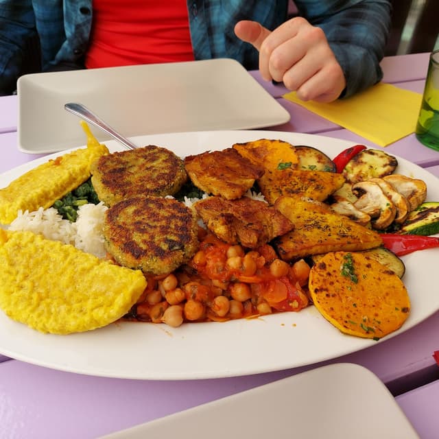 Un mix per 2 persone, ideato per provare un po' tutto quello che preparano come alternativa alla carne: tofu marinato (il mio preferito), medaglione di soia (il preferito del mio ragazzo), burger/polpetta di legumi e verdure, seitan in tempura (buoni ma si sentiva un po' troppo il sapore di frittura). Il tutto era accompagnato da buonissime verdure alla griglia, riso basmati, legumi (in questo caso ceci con pomodoro) e bieta con patate. Mi é piaciuto ogni singolo elemento. 26 euro...prezzo onestissimo!